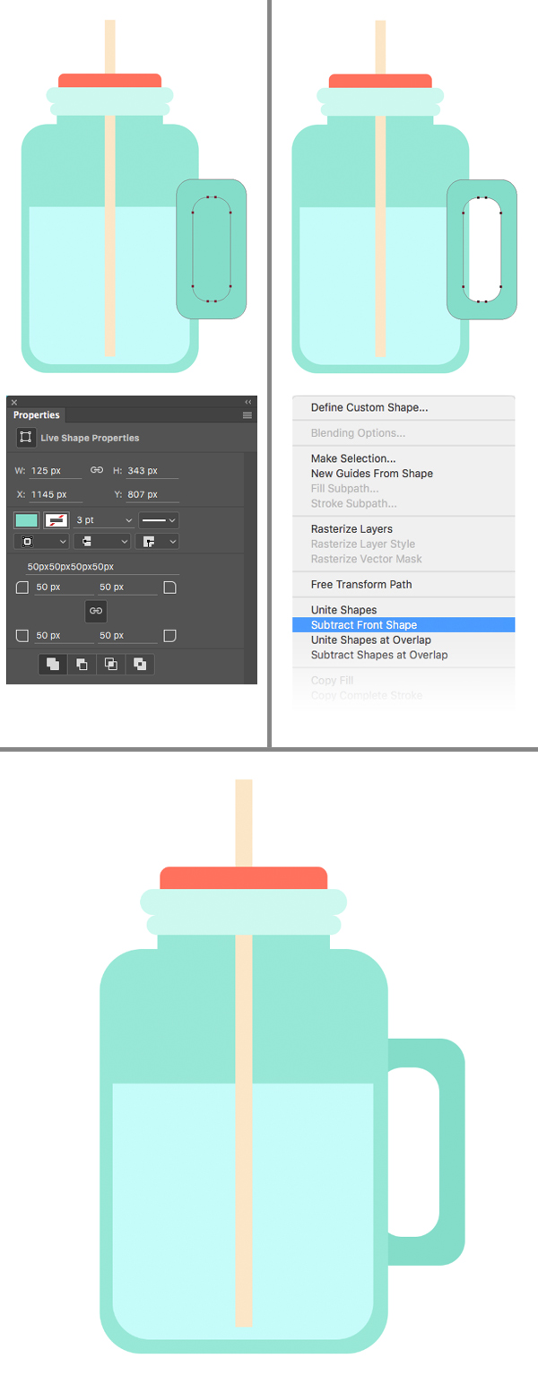现在画另一个矩形,用来覆盖水图形的上部分。 选中两个圆角矩形,并切换到圆角矩形工具(U) ,单击鼠标右键打开下拉菜单。 减去顶层形状,使罐子的顶部是空的。