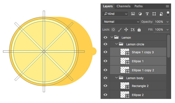 现在我们来做柠檬的主体。 复制(Control-J) 最大的橙色圆形图层,将它像右移动。