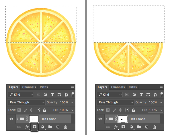 现在使用矩形选择工具(M)选择柠檬片的上半部分。 在图层面板点击蒙板使用油漆桶工具(G)给选择的区域添加黑色。 这样柠檬片的上半部分就不可见了。 现在我们有一个漂亮的半片柠檬片了!