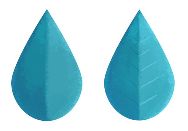 让我们把这个方法应用到叶子上。 创建一个链接图层(创建剪贴蒙板),利用干介质画笔给叶子添加纹理。 使另一半颜色更浅一些。 给叶子的底部添加更深的蓝色。