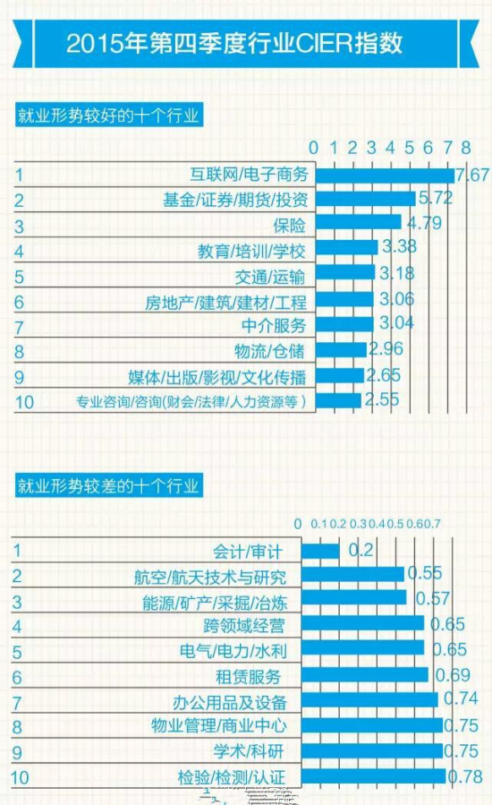 2015年第四季度的《中国就业市场景气报告》表示,和”互联网+”相关的产业、金融、教育等新兴的服务行业依旧保持着较好就业前景,而相对的加工制造业、服务行业等,数据则不太乐观。
