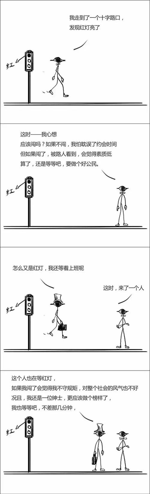 以上漫画摘自最近爆火的《混蛋逻辑》,这种行为逻辑在生活中却十分常见,表现为没有或不敢坚持自己的主见,容易受到别人和外界的影响,随波逐流。